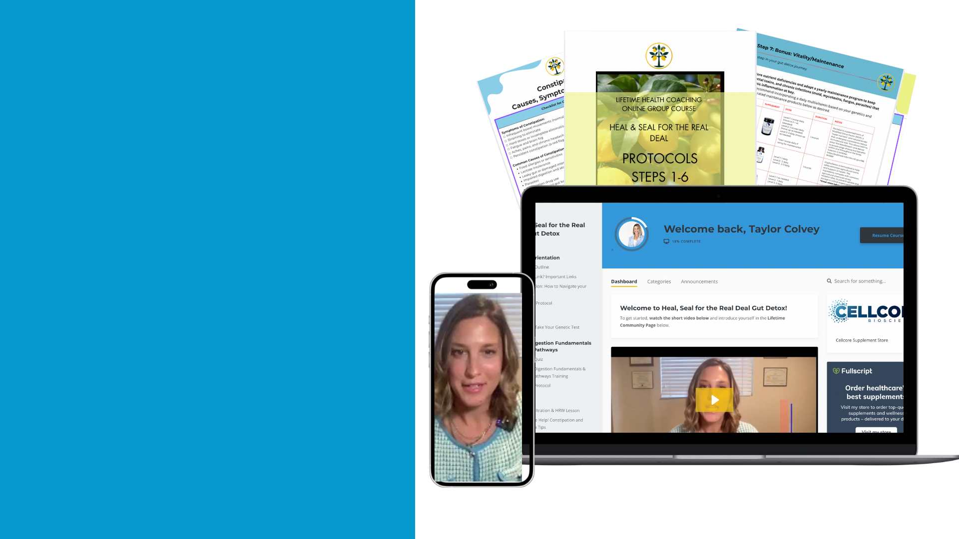 The Heal & Seal for the Real Deal Group Coaching Program is a 6-step online and live group coaching program that builds on the foundational program to help you identify hidden nervous system triggers, repair your gut lining, and detox your system, so your body can finally heal. When you remove the blocks to your natural expression of health, you thrive! Through live group coaching, personalized genetic insights, and step-by-step detox and gut-repair protocols, you’ll clear the confusion, reset your enteric nervous system, and finally reclaim your energy and vitality.